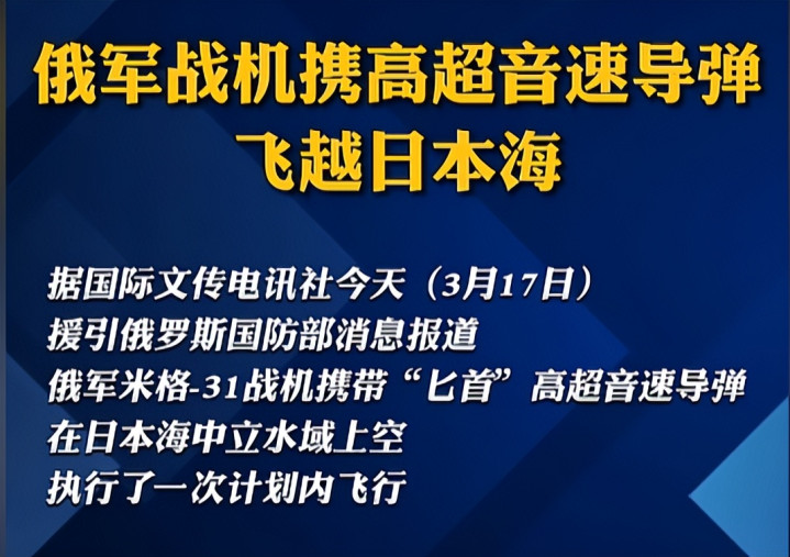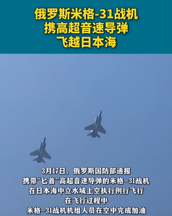 当地时间3月17日,俄罗斯国防部发布官方通报:俄军米格-31战机编队携带“匕首”高超音速导弹,在日本海中立水域完成计划飞行,并实施空中加油训练。
